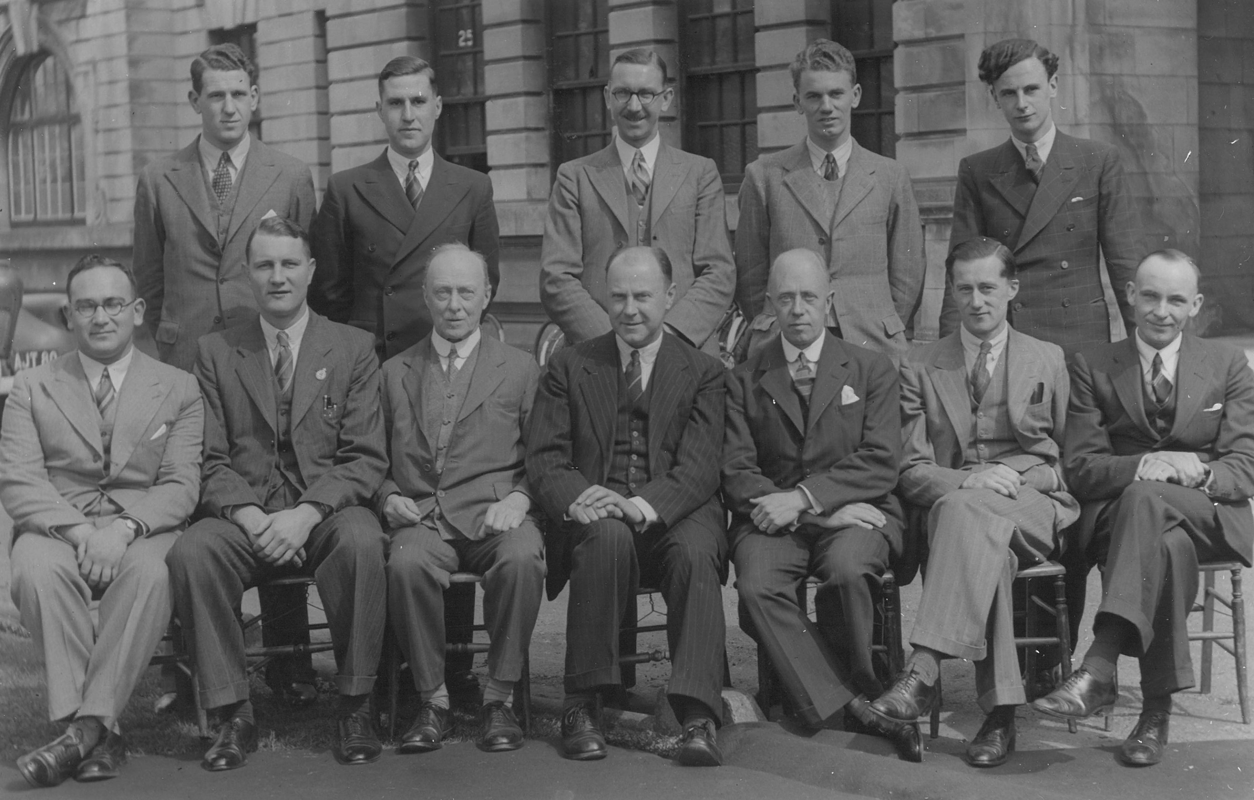 Black and white group photograph taken outside the University College, School of Pharmacy, Cathays Park, Cardiff. The photograph shows a group of staff of the School of Pharmacy.
