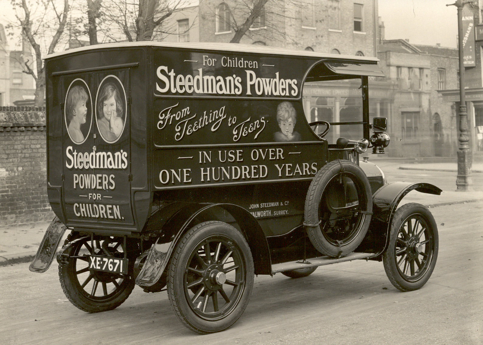 Black and white photograph of a Steedman delivery van. The photograph shows a van with the body work of 1913 adapted to a Beardmore chassis. Steedman’s Powders are advertised on the van.