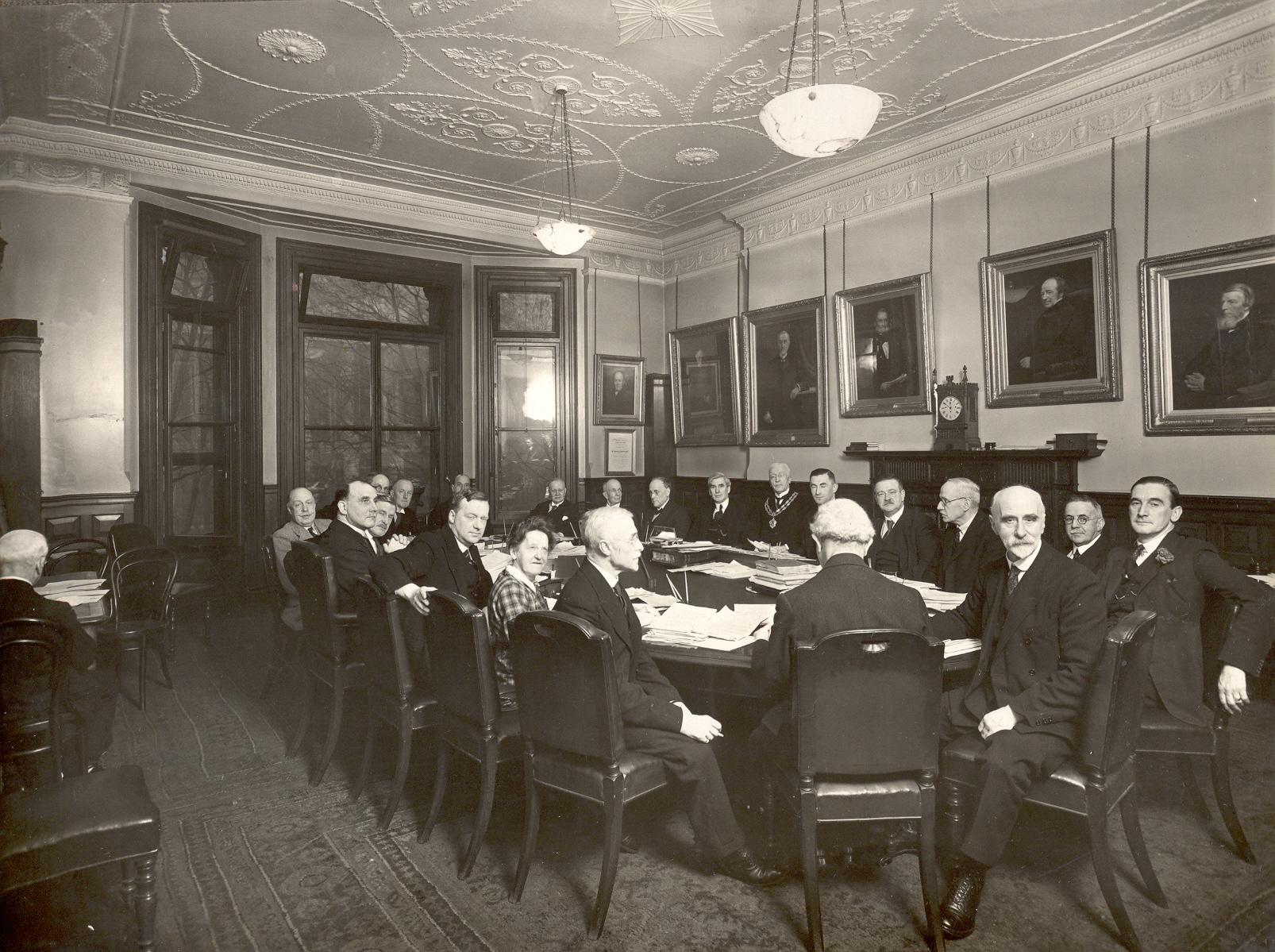 Black and white photograph of a Meeting of the Council of the Pharmaceutical Society at 17 Bloomsbury Square, London. The photograph shows the council seated around a table in the council room. Those attending included the President A.R. Melhuish, the Secretary H. Linstead, J. Keall, E. Saville-Peck, A. Freke, T. Marns, J. Jack, T. Gutherie, and F. Browne.