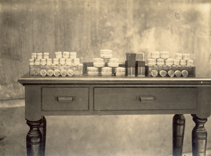 Black and white photograph of finished packed and labelled products arranged on a table, in Hong Kong, China. This picture is part of a series on opium production in Hong Kong. The opium is on display at a government monopoly factory. This photograph was taken in 1915, towards the end of the opium trade. The opium trade between Britain and China with was the result of two wars (1839-42 and 1856-60), and had a detrimental impact on the people of China where the drug was sold, and the people of India, where the drug was farmed.