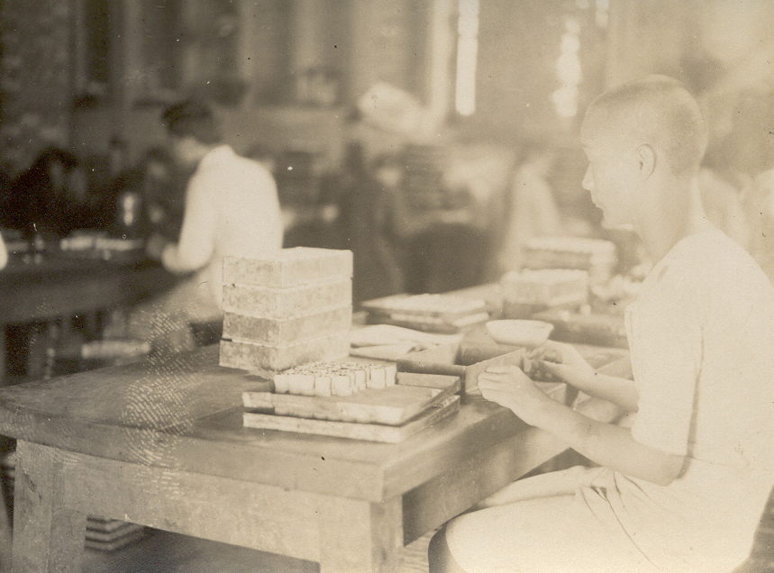 Black and white photograph showing a man at tables packing small tins of opium, at a factory, Hong Kong, China. This picture is part of a series on opium production in Hong Kong. This photograph shows a man in the foreground packing small tins of opium, with other people carrying out similar work in the background, in a government monopoly factory. This photograph was taken in 1915, towards the end of the opium trade. The opium trade between Britain and China with was the result of two wars (1839-42 and 1856-60), and had a detrimental impact on the people of China where the drug was sold, and the people of India, where the drug was farmed.