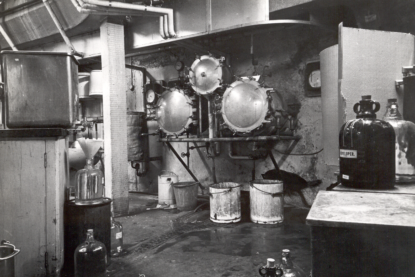 Black and white photograph of an area of the laboratory of the pharmacy department at St. George’s Hospital, London. The photograph shows lab equipment, large empty bottles and buckets.