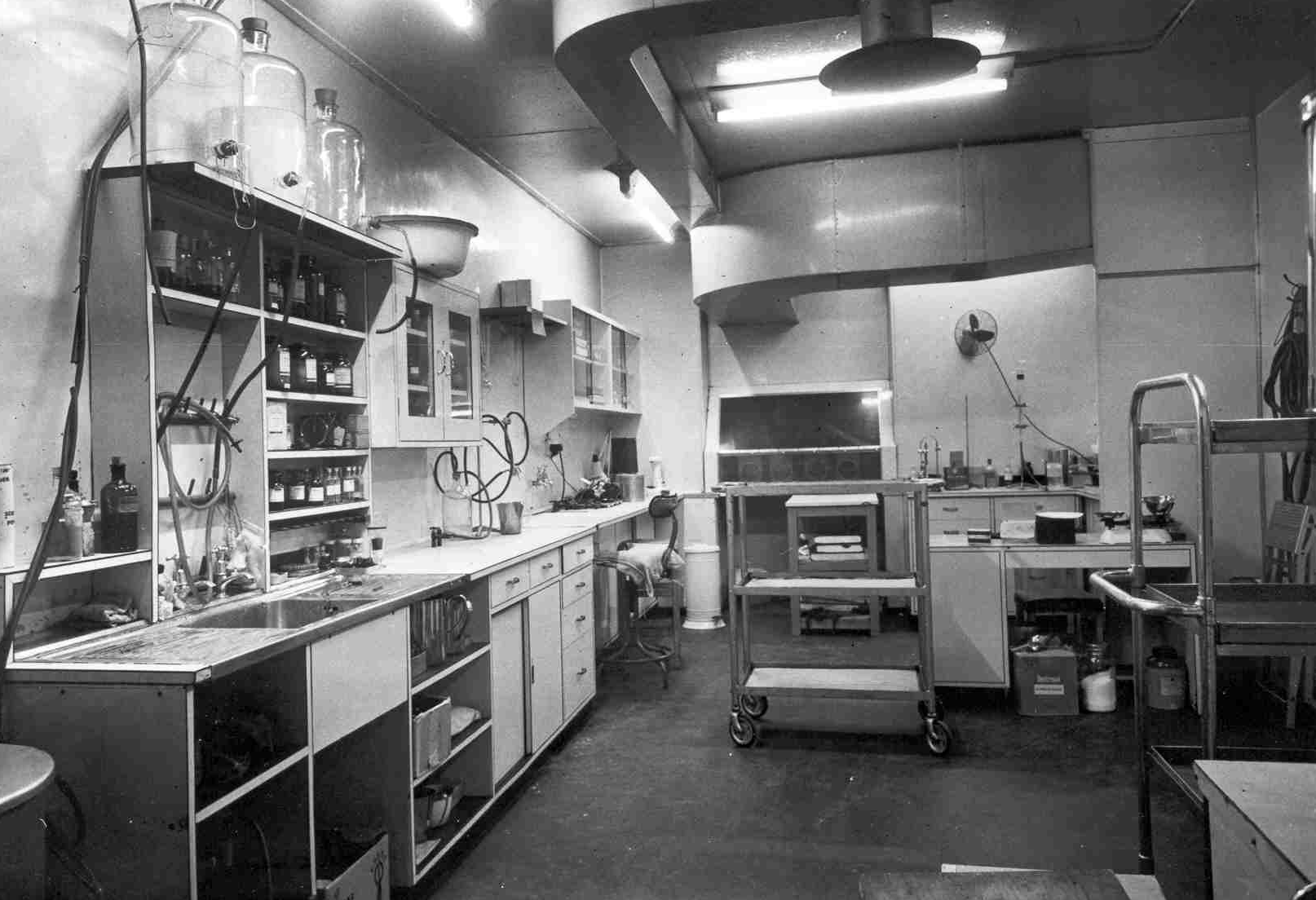 Black and white photograph of the Sterile products laboratory at St. George’s Hospital, London. The photograph shows pharmaceutical equipment, trolleys and sink are visible. Draws and cabinets for equipment and glass bottles.
