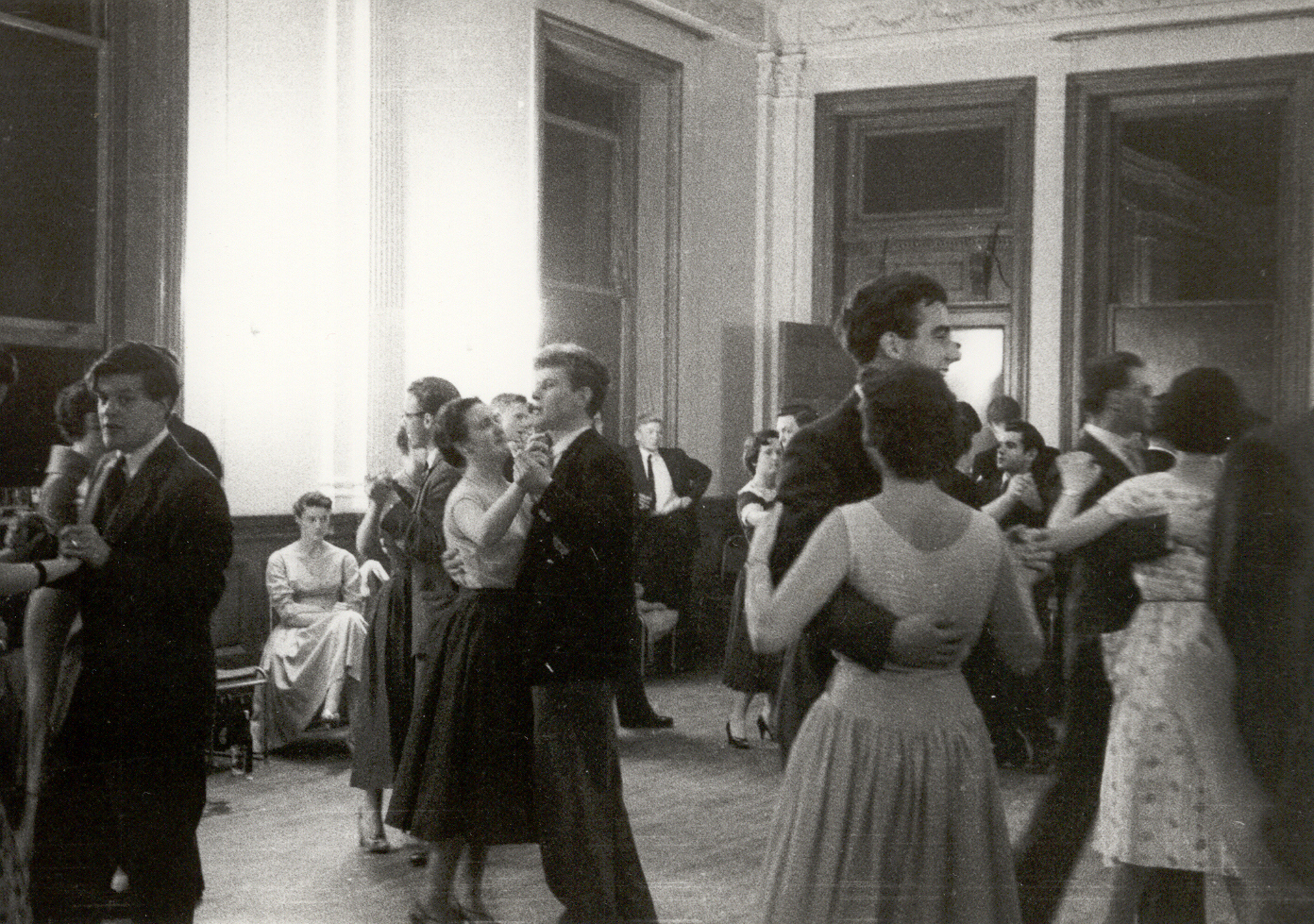 Black and white photograph of a group of students at the School of Pharmacy, 17 Bloomsbury Square, London. This photograph shows a group of students in a large room dancing with partners.