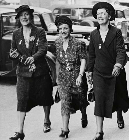 Black and white photograph of three women at the British Pharmaceutical Conference, Edinburgh, 1938. The photograph shows three women walking down the street to catch the bus for the excursion to Peebles.