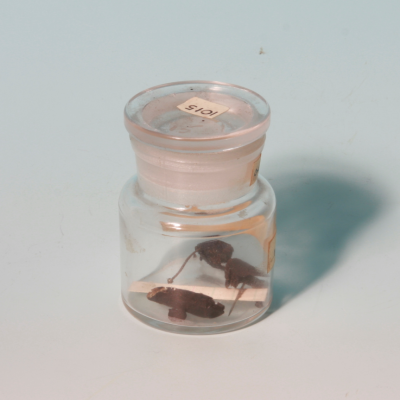 Glass specie jar containing a paper-wrapped specimen of the lichen Usnea florida from a human skull. Tied in a silk bag and applied to the affected area, it was used to stop nosebleeds. From the Burges Collection.